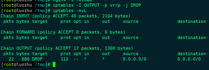 测试2: 增加规则:iptables -I OUTPUT -p vrrp -j DROP,从上出现出现了 vip ,但 主上 vip 依然没有释放