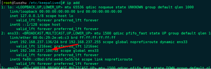 测试4: 重启主上的 keepalived,访问 vip,使用ip add查看,刷新几次后,马上回到了主上的默认虚拟服务器