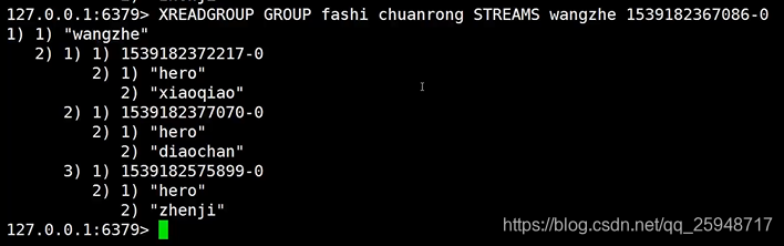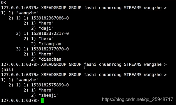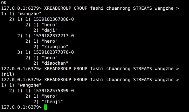 >表示读取最新的消息,第二次执行的>,是又插入之后读取的。