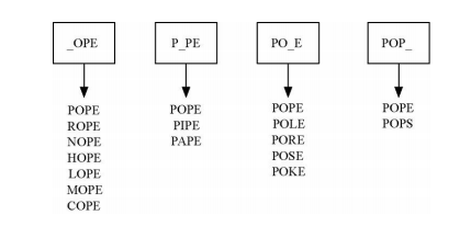 采⽤下述⽅法,可以更⾼效地构建这个关系图。假设有数⽬巨⼤的桶,每⼀个桶上都标有⼀个⻓度为4的单词,但是某⼀个字⺟被下划线代替。当处理列表中的每⼀个单词时,将它与桶上的标签进⾏⽐较。使⽤下划线作为通配符,我们将POPE和POPS放⼊同⼀个桶中。⼀旦将所有单词都放⼊对应的桶中之后,我们就知道,同⼀个桶中的单词⼀定是相连的。