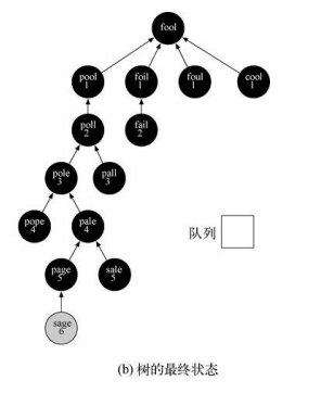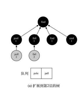 队列中的下⼀个顶点是foil。唯⼀能添加的新顶点是fail。当bfs 函数继续处理队列时,后⾯的两个顶点都没有可供添加到队列和树中的新顶点。下图展⽰了树和队列在扩展了第2层之后的状态。