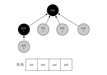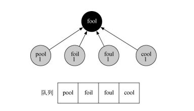 来看看bfs 函数如何构建对应于图7-5的宽度优先搜索树。从顶点fool开始,将所有与之相连的顶点都添加到树中。相邻的顶点有pool、foil、foul,以及cool。它们都被添加到队列中,作为之后要访问的顶点。下图展示了正在构建中的树以及完成这一步之后的队列。