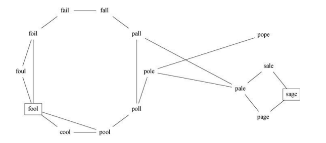 eg: FOOL -> POOL -> POLL -> POLE -> PALE -> SALE -> SAGE