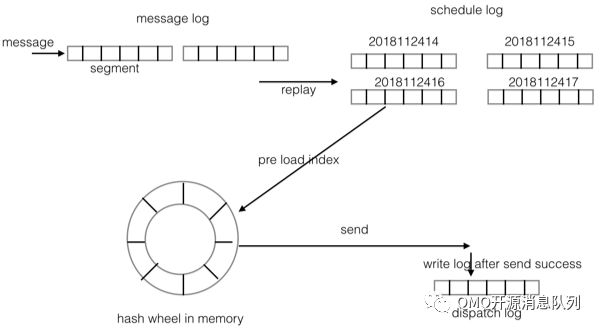 offset是指向前面log的偏移,而schedule time是消息的到期时间。这样我们每次只需要加载一个段(比如2019021813)的索引到内存就行了,内存中的hashwheel根据schedule time决定到期时间,到期后根据offset读取到消息内容将消息投递出去。