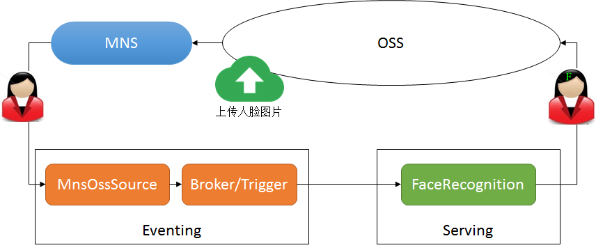 通过 OSS 控制台上传照片,MnsOss 事件源接收图片上传的事件信息,发送到 Knatvie Eventing,通过Broker/Trigger事件处理模型之后,接着触发 Knative Serving 中的人脸识别服务进行分析。最后把分析之后的图片回传到 OSS。