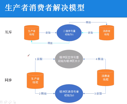 解决生产者消费者问题实际上是要解决线程间互斥关系问题(指的是共享资源)同步关系问题(线程的步调)