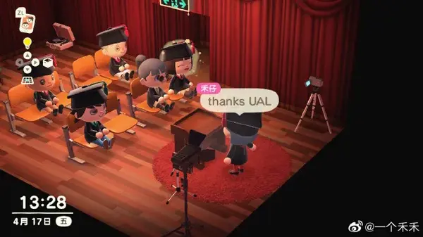 而在新冠疫情期间,大学无法如常举办毕业典礼,毕业于伦敦艺术大学(UAL)的玩家 @一个禾禾就在动森世界中为自己和同学举办了一场别出心裁的毕业典礼。