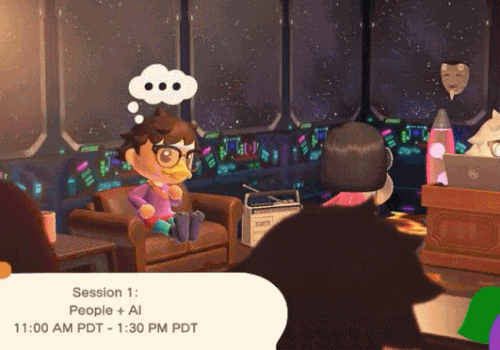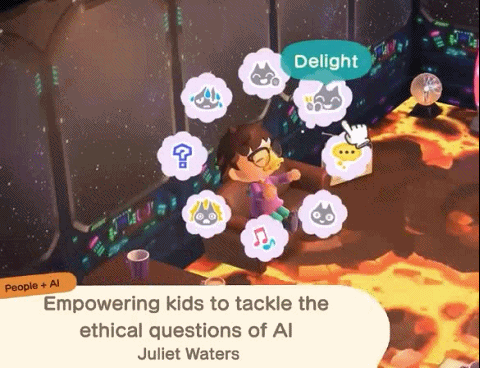 第一位上场的是 Juliet Waters,她的演讲主题是《让儿童解决人工智能的道德问题》。显然,在动森里做 Presentation 不是一件非常容易的事,主持人需要亲自提醒讲者上台,并耐心等待对方的反馈。