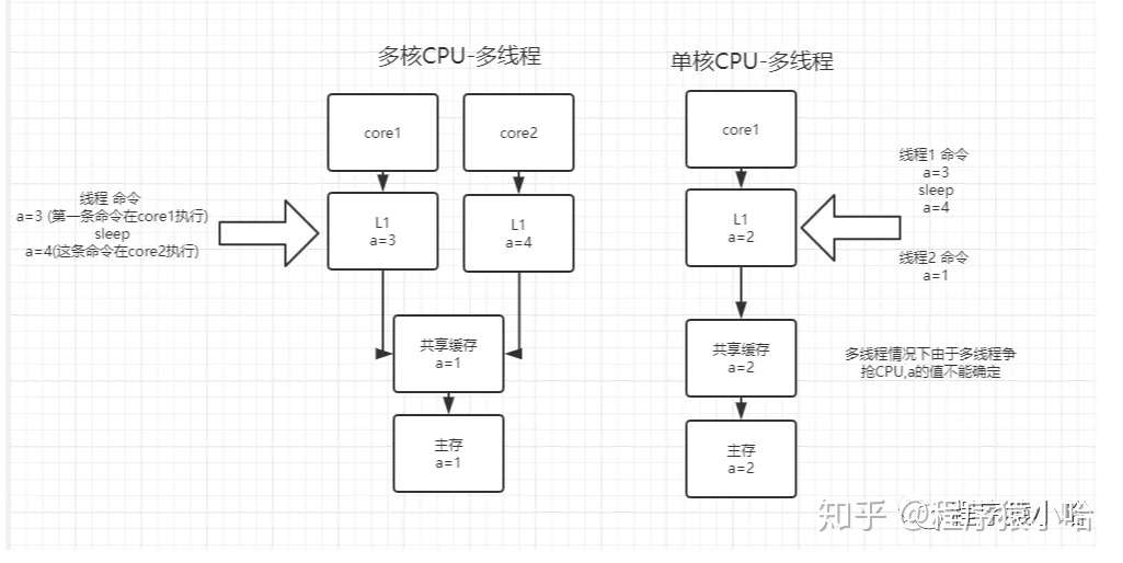 - 单核 CPU,多线程:进程中多线程同时访问缓存,获取的缓存地址相同,不会出现缓存丢失等问题,但是会出现,多线程同时操作同一缓存数据导致数据错误的情况.(CPU 处理非原子性,多线程互相争抢运行,会出现处理一半共享数据被其他线程更新的情况-->并发)