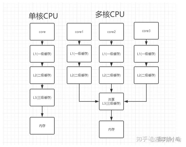 众所周知,CPU 是有单核和多核之分.在单核 CPU 的时候,只需要一套 L1,L2,L3 缓存.但是当多核时,每个核心都必须有自己的一套 L1(甚至 L2)缓存,而共享 L3(或 L2)缓存.