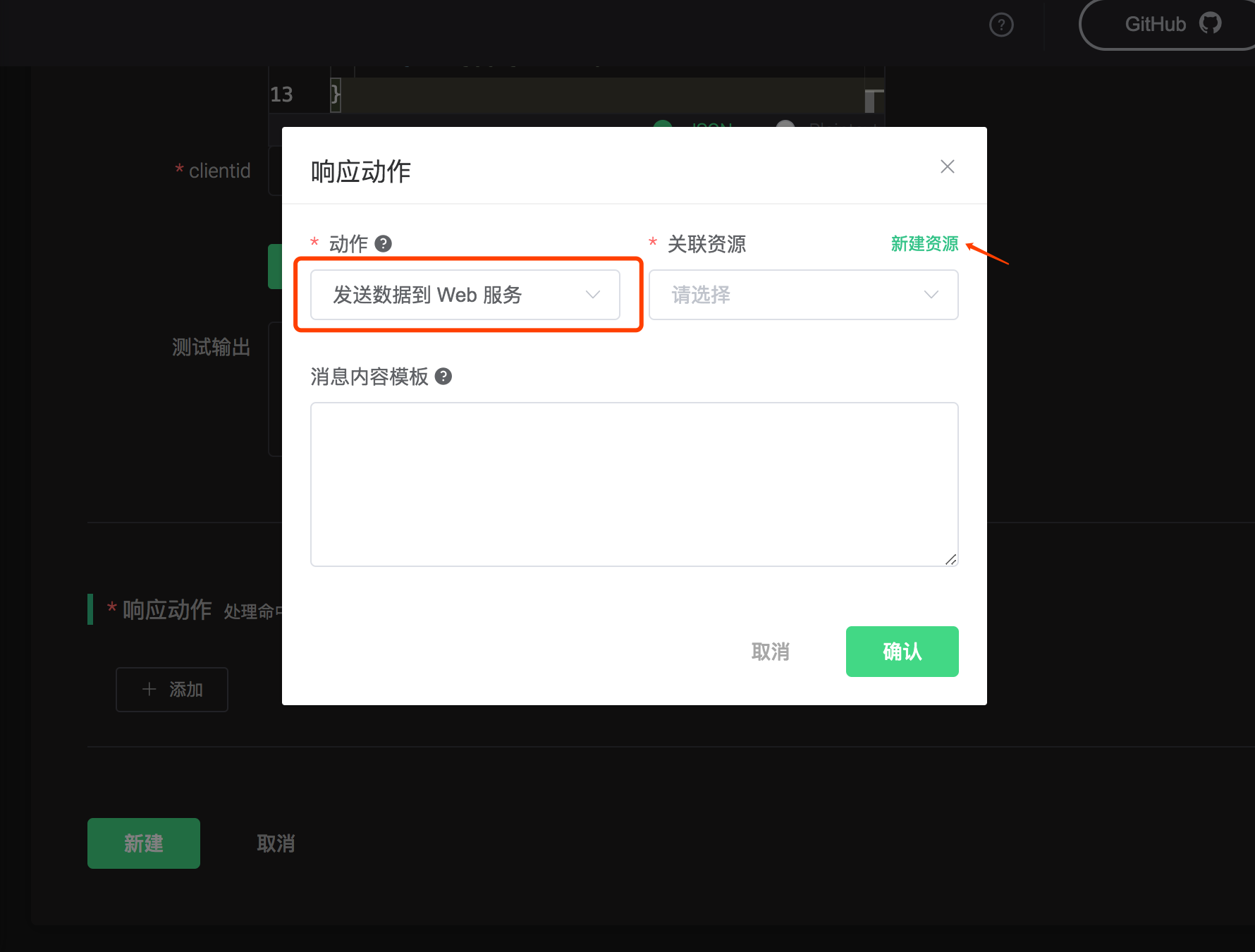 在响应动作创建页面选择新建的资源,并填入消息模板内容即可。