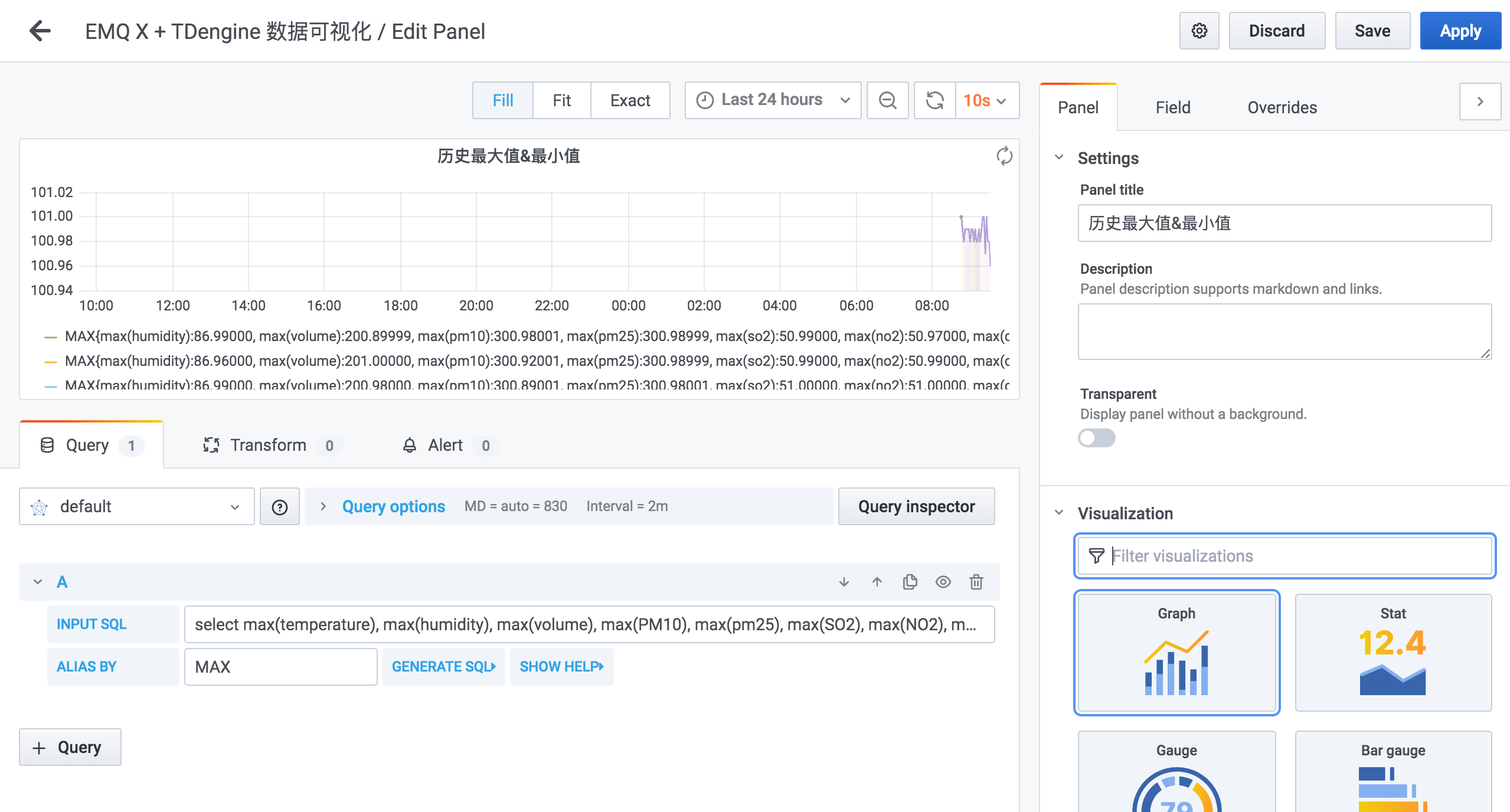 继续点击 Dashboard 的 Add panel 按钮,添加最大值、最小值图表。操作步骤同添加平均值,仅对查询中 SELECT 统计方法字段做出调整,调整为 AVG 函数为 MAX 与 MIN: