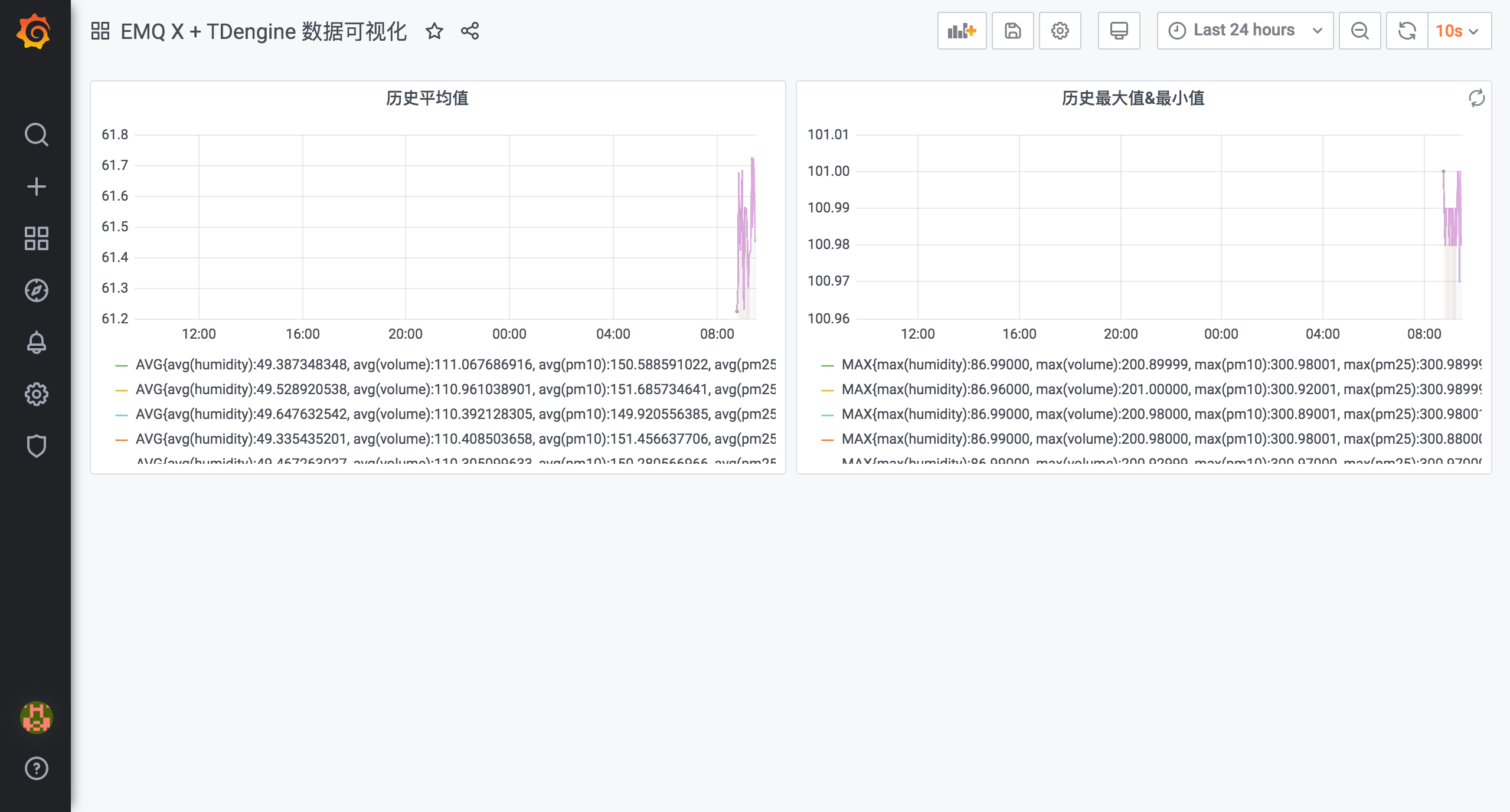 至此我们借助 EMQ X + TDengine 完成了物联网数据传输、存储、展现整个流程的系统搭建,读者可以了解到 EMQ X 丰富的拓展能力与 TDengine 完备的大数据平台特性在物联网数据采集中的应用。深入学习掌握 Grafana 的其他功能后,用户可以定制出更完善的数据可视化乃至监控告警系统。