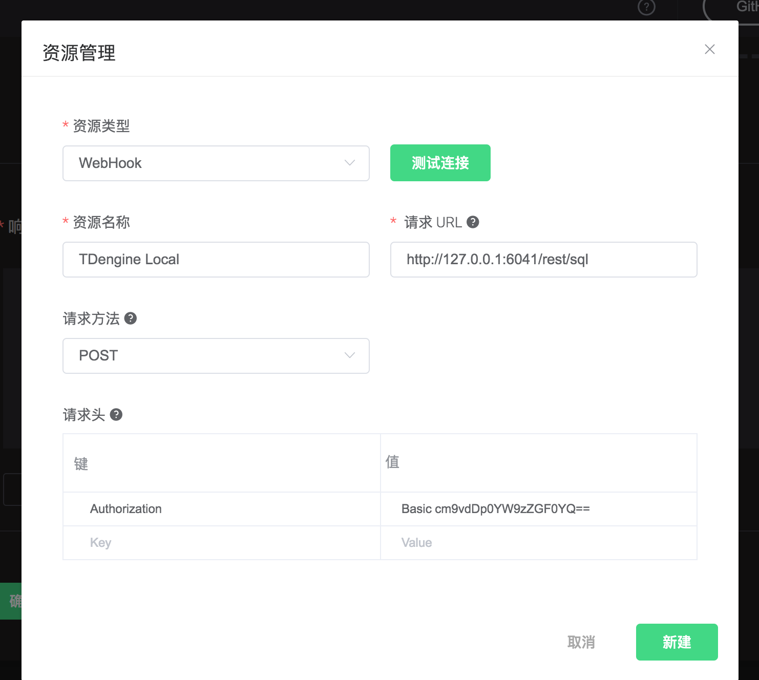 资源类型选择 Webhook,请求 URL 填写 http://127.0.0.1:6041/rest/sql,请求方法选择 POST,还需添加 Authorization 请求头作为认证信息。