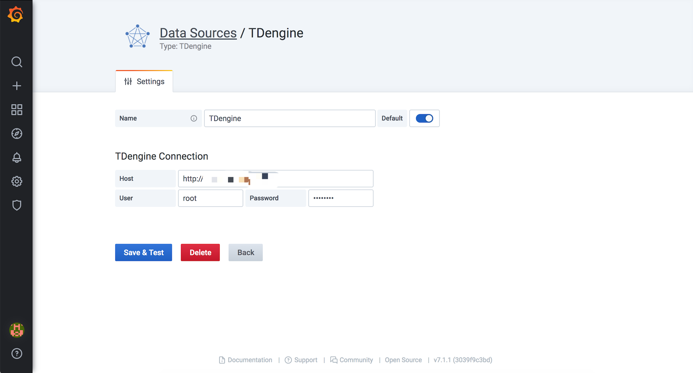 添加数据源,即显示的数据源信息。选取 TDengine 类型数据源,输入连接参数进行配置,默认情况下,关键配置信息如下: