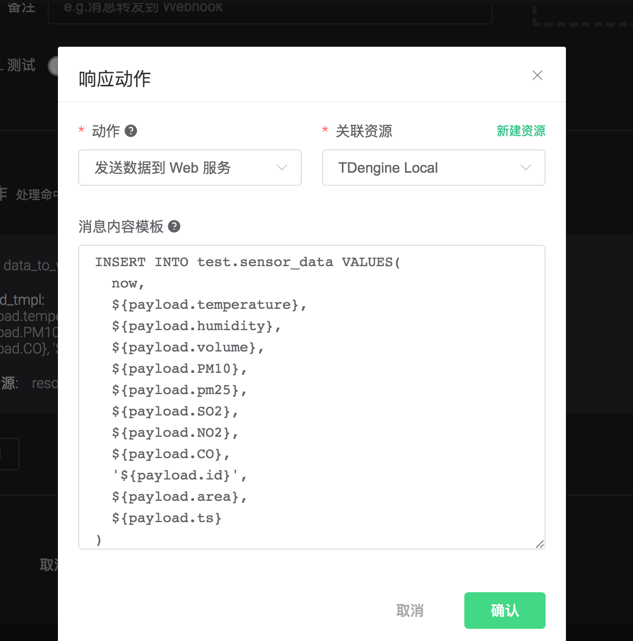 - 消息内容模板:此处为携带数据的 INSERT SQL,注意我们应当在 SQL 中指定数据库名,字符类型也要用单引号括起来, 消息内容模板为: