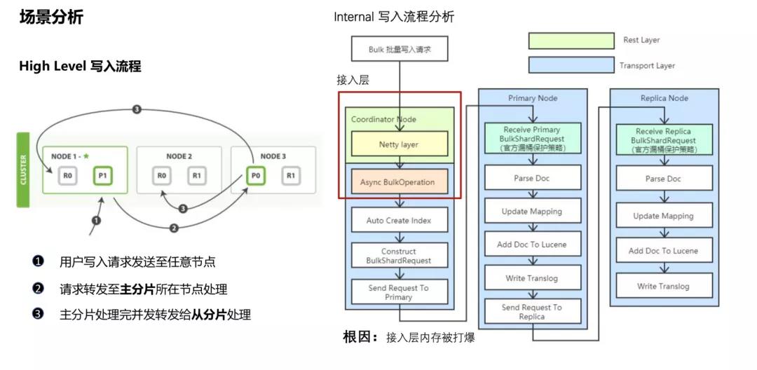 右边是更细节的写入流程,而我们从堆栈中看到的写入请求堆积的位置就是在红色框中的接入层,节点挂掉的根因是协调节点的接入层内存被打爆。