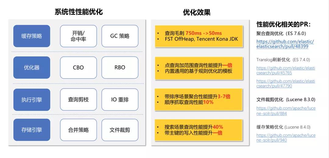 腾讯云ES在社区开源的内核之上,根据云上的内外部业务的场景案例积累,做了大量的内核优化。除了上面介绍的translog的优化,还有带“_id”的写入操作剪枝优化、查询计划优化等等,满足了客户在性能方面的需要,并积极将一些通用的优化提交至社区,截至目前为止,腾讯云提交的pr约有50+被合并到了主干。