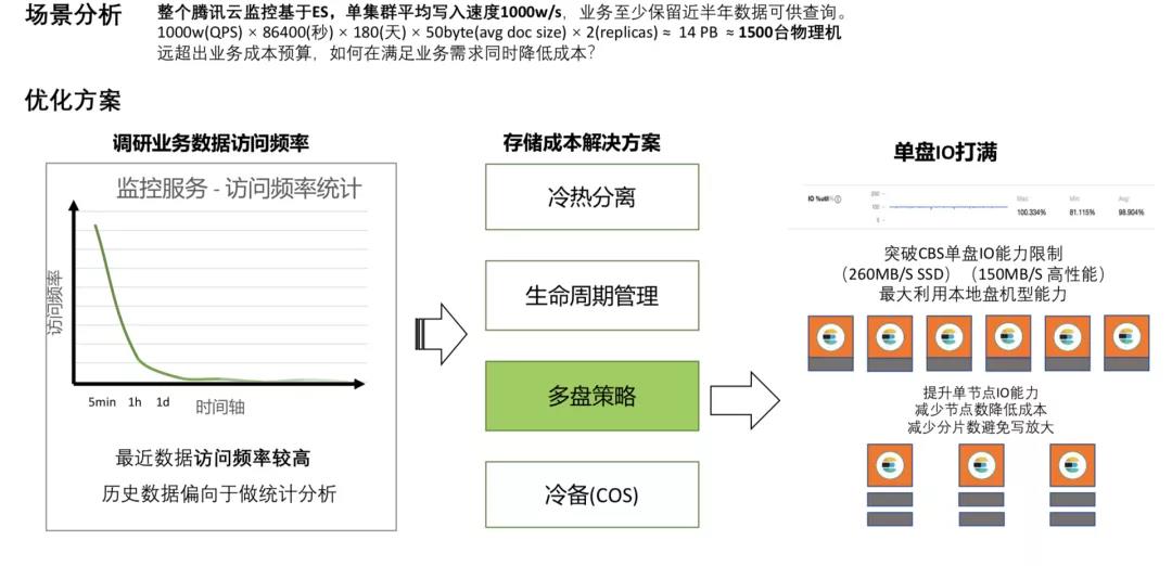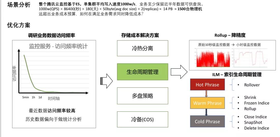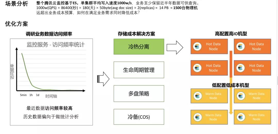 腾讯云自身的监控系统也是基于 ES 来做的,特别对于一些大的地域的集群,它的写入速度甚至达到了千万级每秒。面对这样的吞吐量,并且数据量至少要保留半年时间的可空查询,预估整个集群大概需要能承载 14PB 的数据,按照我们内部用的物理机磁盘的规格,需要 1500 台物理机,远远超出成本预算。