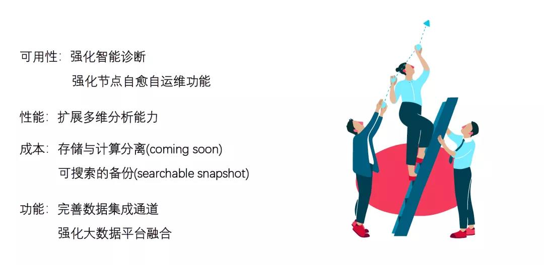 未来在可用性方面,我们会加强智能诊断的功能,因为 ES 在很多方面都需要用户来操心。比如索引设置不太好,可能会导致并发性能不高等等。对于 ES 使用不是特别熟的用户可能会有这样的苦恼,感觉集群经常莫名其妙会出现一些问题,当然也可能是自己使用上没有注意。