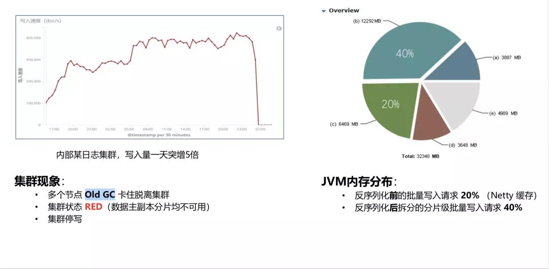 例如早期我们内部一个日志集群,写入量一天突增 5 倍,集群多个节点 Old GC 卡住脱离集群,集群 RED,写入停止,给我们带来了不小的麻烦。
