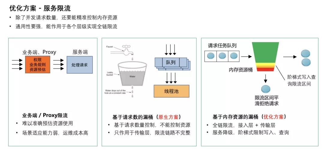 针对这种高并发场景,我们的优化方案是服务限流。除了要能控制并发请求数量,还要能精准地控制内存资源,因为内存资源不足是主要的矛盾。另外通用性要强,能作用于各个层级实现全链限流。