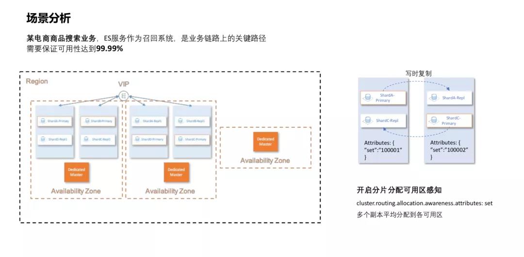 在更基础的场景下,比如我们的机器、集群,甚至整个机房挂掉,这种情况下的可用性光靠优化是难以彻底解决的。所以为了达到某些客户,比如电商或者金融客户对关键业务的可用性要求,腾讯云 ES 提供了集群的多可用区部署方案。