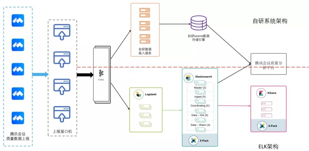 下图展示了整个系统的架构图,红线上面部分是原先使用的质量分析系统。腾讯会议的质量数据,由上报接口机采集后到我们自研的接入服务,做数据清洗或转换的ETL过程,最后把数据写入到自研的 lucene 数据存储引擎里,提供数据查询和分析能力。