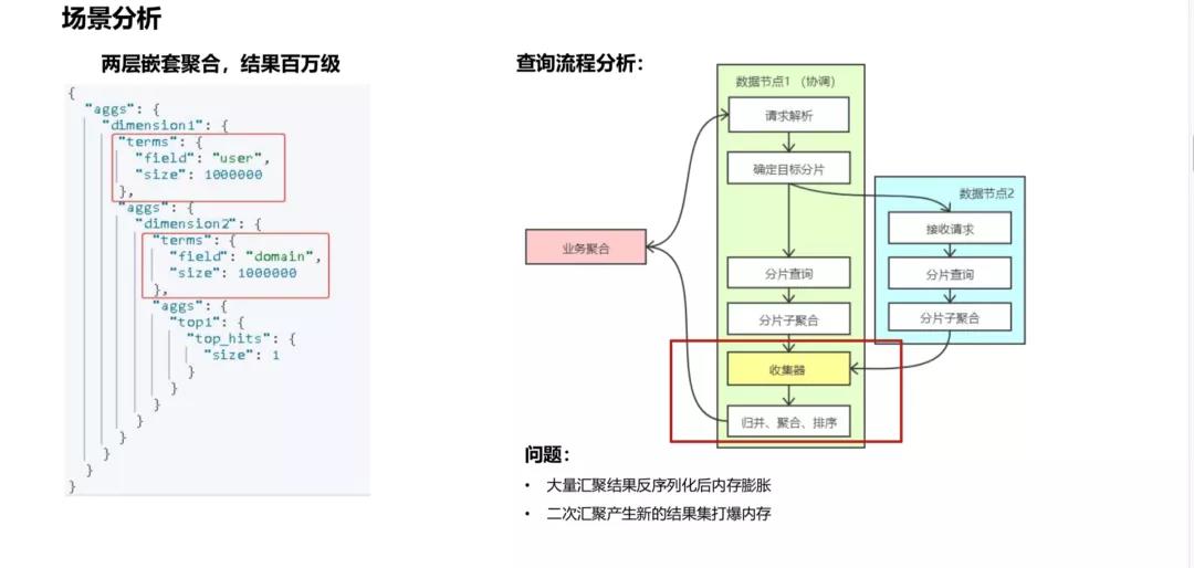 原生 ES 对查询方面的限制也是比较死的,限制最大返回结果桶数,默认是一万,如果超过这个限制则直接拒绝。但分析场景结果桶数十万、百万是常态,默认1万是不够的。另外这个值也是很难精确设置的,调整不灵活,大了内存会崩掉,小了满足不了业务需求,所以我们也要对它进行优化。