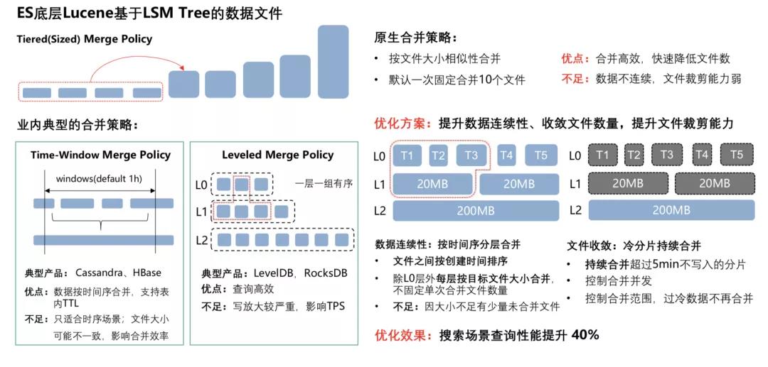 在性能方面的优化,首先在数据合并方面。ES 的底层 Lucene 基于 LSM Tree 的数据文件。合并策略业内有几种典型方案,比如按时间序进行合并,比如把当前一小时内的数据进行合并,典型产品有 Cassandra 、HBase 等。但是它只适合时序场景,而且因为每个小时数据写入量不太一样,导致文件合并的大小不太一致,会影响合并的效率。