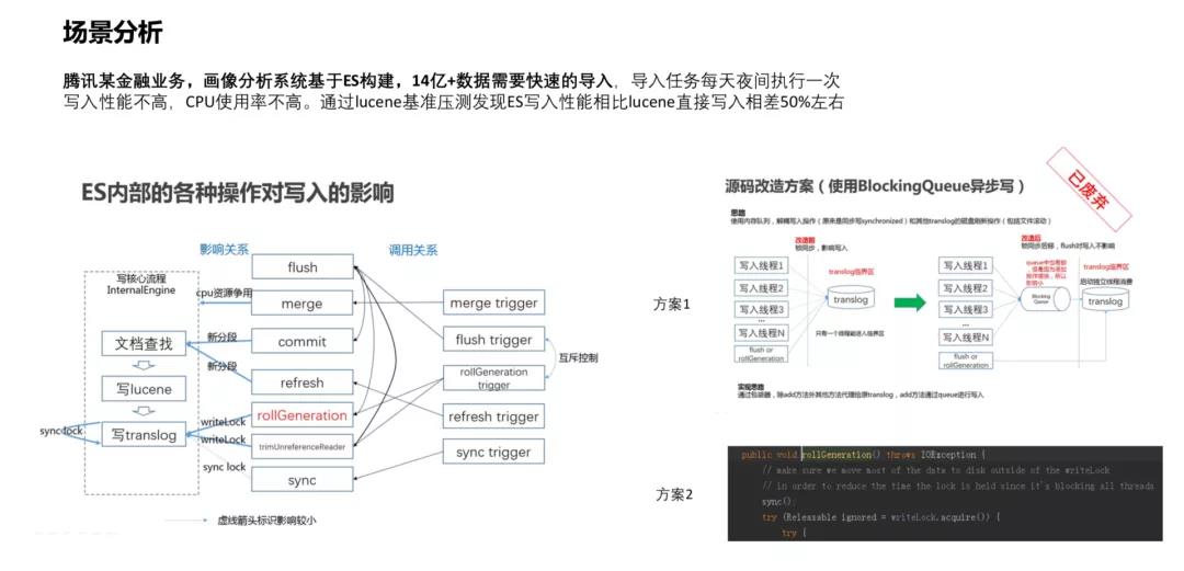 所以我们就对腾讯云 ES 的各种写入流程做了一个分析,发现 Lucene 写入就是单纯地写入数据,但 ES 是一个分布式的系统,为了防止内存里面的数据没有及时刷盘,我们会写一个translog,对应数据库里面的binlog机制。