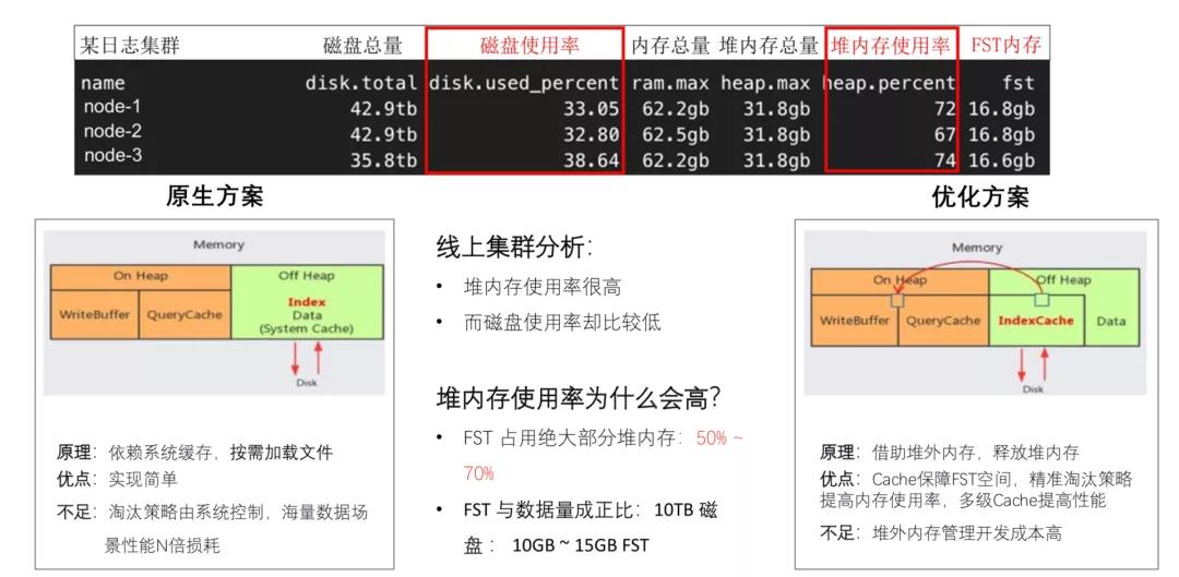 原因主要在于索引里面的 FST 占用了大量内存,基本维持在 50%-70% ,而且需要常驻内存不能释放。计算发现,大概每 10TP 的磁盘就需要 10G-15G 来存 FST 缓存。