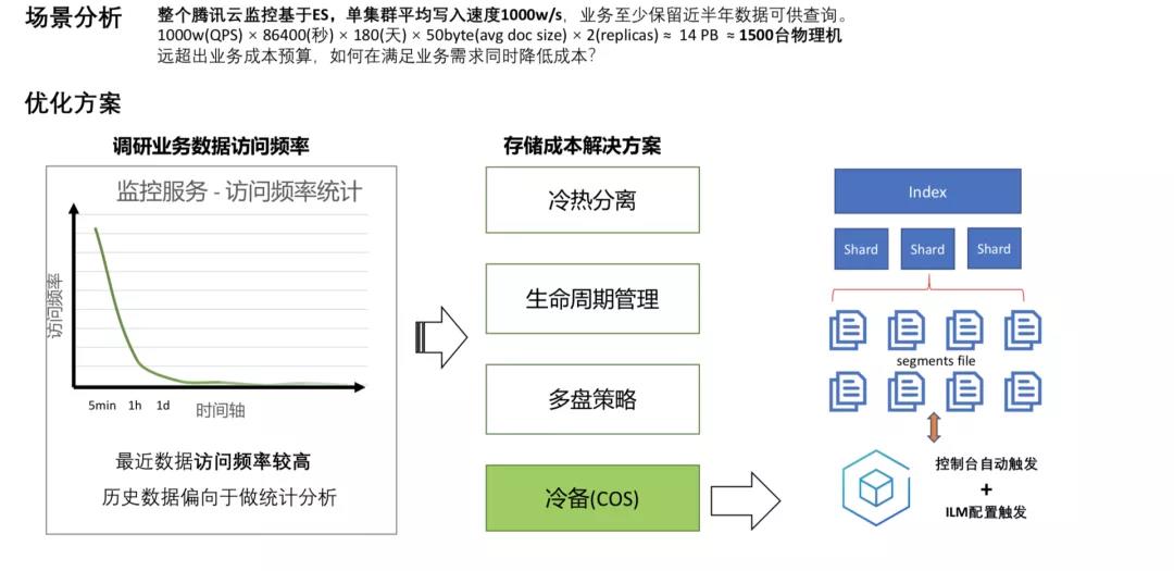 ES 的索引数据每个上面其实分了很多的小文件,所以我们做了一个 COS 上传下载的插件,可以在控制台自动触发或者在 ILM 配置触发,把这些底层数据文件直接备份到成本非常低的 COS 上。如果真的某一天系统数据出现了问题,也可以很方便恢复过来。