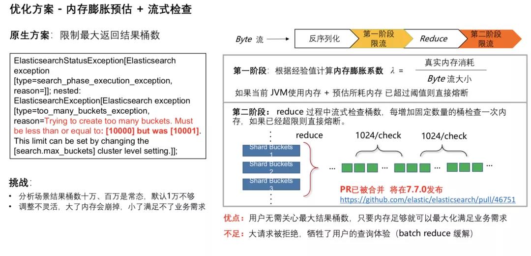 第二阶段,reduce 过程中流式检查桶数,每增加固定数量的桶就检查一次内存,如果发现超限则直接熔断。比如总量一万桶,每新增 1024 个桶就需要再检查一次内存,如果超过限制,就直接把这个比较大的聚合查询杀掉。