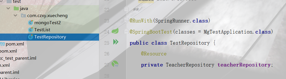 @RunWith(SpringRunner.class) @SpringBootTest(classes = MgTestApplication.class) public class TestRepository { @Resource private TeacherRepository teacherRepository; }