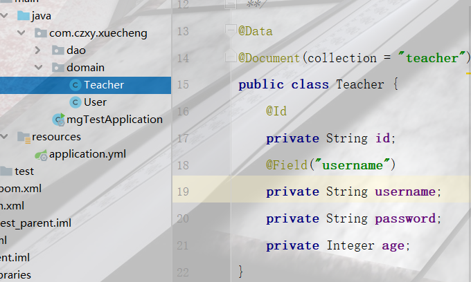 @Data @Document(collection = "teacher") public class Teacher { @Id private String id; @Field("username") private String username; private String password; private Integer age; }