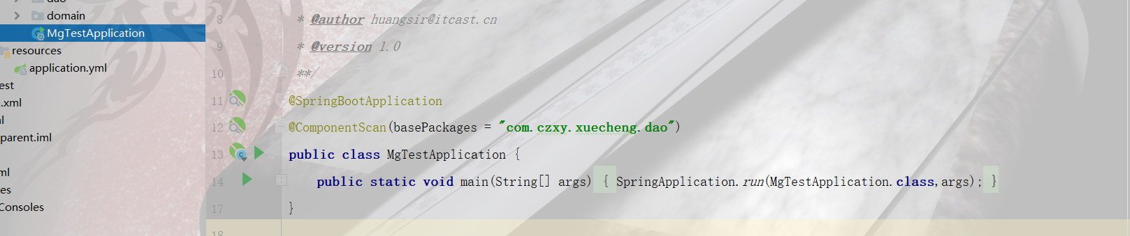 @SpringBootApplication @ComponentScan(basePackages = "com.czxy.xuecheng.dao") public class MgTestApplication { public static void main(String[] args) { SpringApplication.run(MgTestApplication.class,args); } }