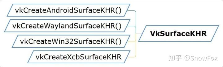 Vulkan 使用 VkSurfaceKHR 表示逻辑表面对象。 不同的平台有不同的 API 来创建 VkSurfaceKHR 表面对象,例如 vkCreateWin32SurfaceKHR(),vkCreateAndroidSurfaceKHR()和 vkCreateXcbSurfaceKHR():