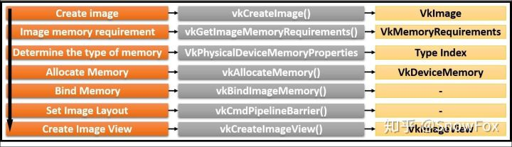 - 创建深度图 depth image:与彩色图像类似,您需要深度图进行深度测试;但与 WSI 预烘烤的交换链图像不同,深度图需要由应用程序创建。首先,您需要创建一个深度图对象(VkImage),按照下面的步骤分配内存,创建图像布局并最终生成图像视图对象(VkImageView)。