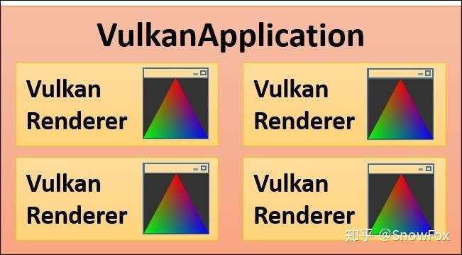 VulkanRender 类在 VulkanRenderer.h / .cpp 中定义。 在应用程序中,该类管理一个特殊的展示窗口及其相关资源,例如设备,交换链,管线等。 一个应用程序可以有多个渲染窗口,如下图所示;每个渲染器都会处理一个单独的展示窗口及其对应的所有资源。