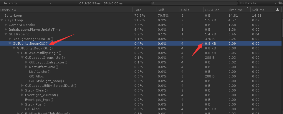 A:OnGUI必然有GC Alloc,即使是空函数。你可以拿宏括起来,用来做Profiling的包不要编译进去。