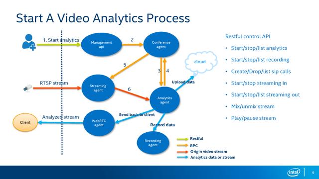 同时,在图中我们可以看到,分析过程是与OWT整套方案协同工作,OWT提供很多控制的API,例如分析、录像、sip calls、从不同的协议接入,如果想要将分析好的流推给RTMP服务器,方案也配有Streaming OUT接口进行推送,也有针对混合流、暂停/继续播放流等操作。