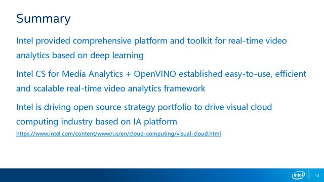 英特尔一直在致力于Visual cloud、Computing等基于IA平台的发展,同时也提供了很多开源资源,例如Open VINO、OWT 在GitHub上有相应的开源项目。同时英特尔在客户端也有一些AI的方案,例如WebNN等,未来也将在浏览器上落地,敬请期待。