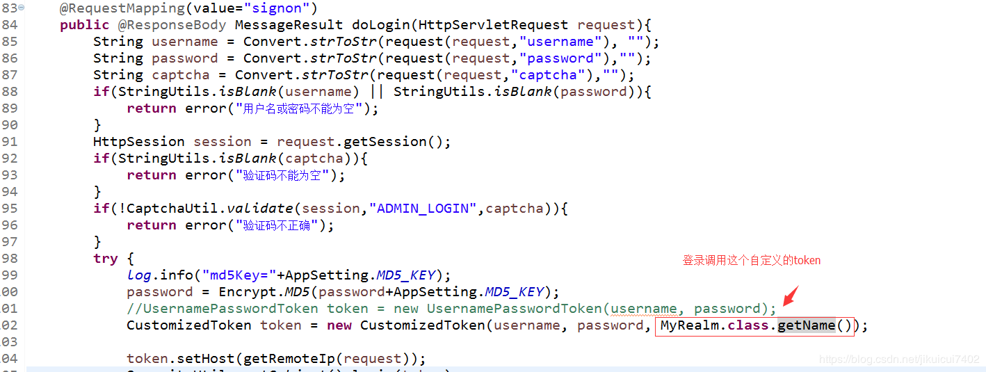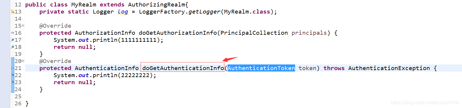 当调用SecurityUtils.getSubject().login(token); 即subject的login 方法;默认会调用realm里面的doGetAuthenticationInfo方法进行身份验证。但上面设置了 配置使用自定义认证器