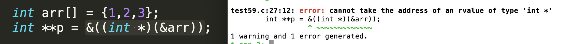 例如int arr[] = {0,1,2};,当我们 &arr时,由于并没有计算,所以无法作为常量指针,&arr获取的是作为数组的指针,而当我&((int *)(&arr))就得到不能获取地址的错误。
