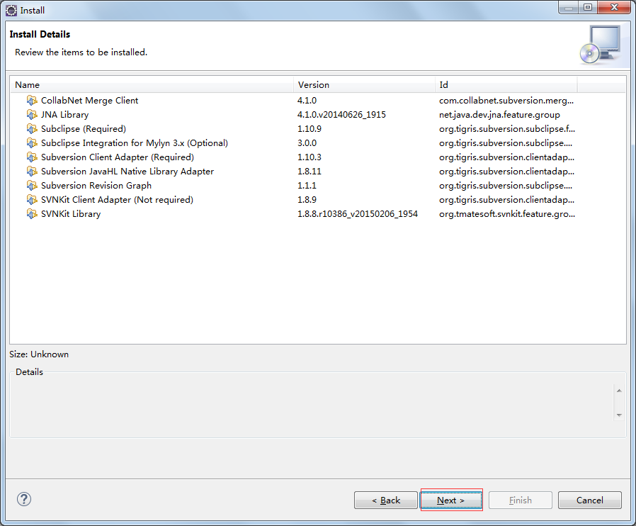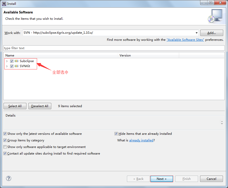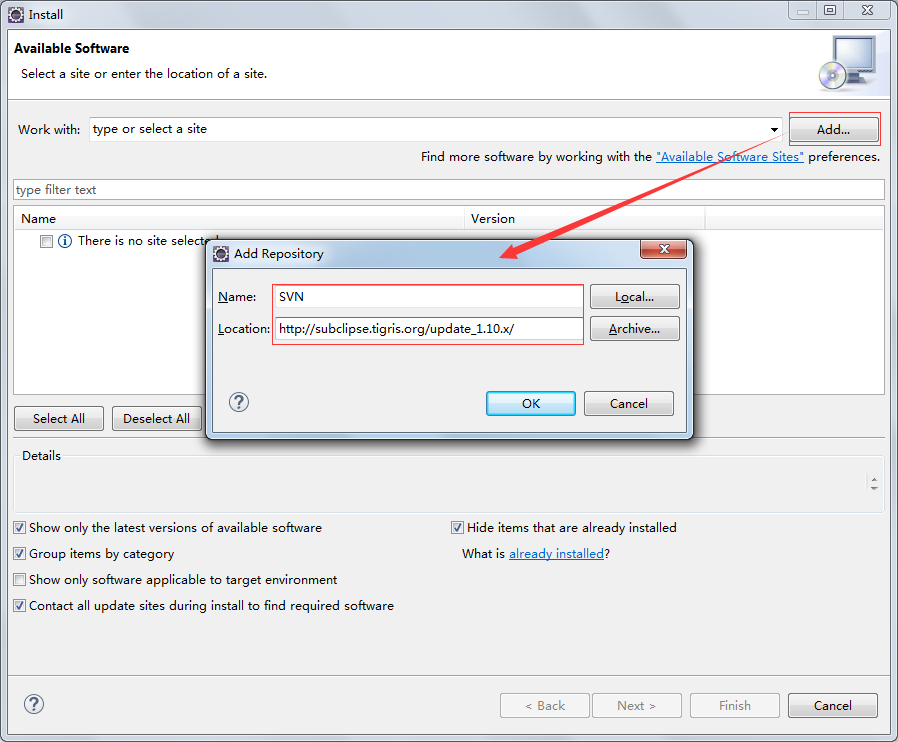 其中http://subclipse.tigris.org/update_1.10.x是最新版本的SVN插件的下载站点【subclipse是Eclipse的SVN插件】。