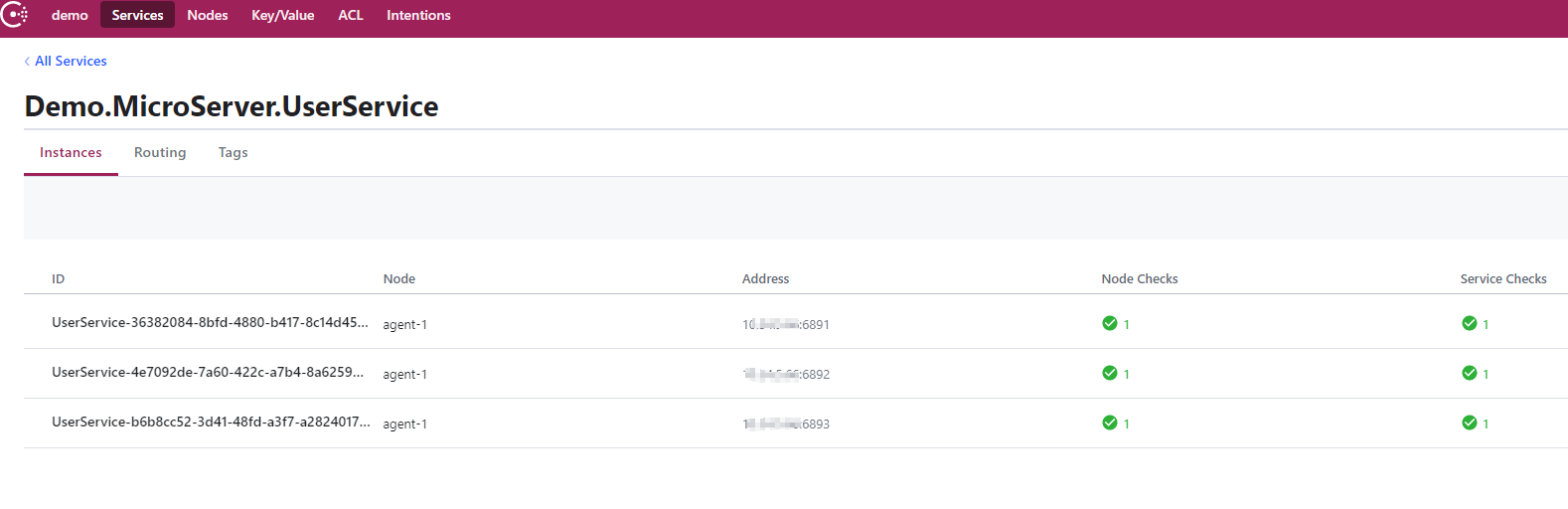 这里演示,分别在6891,6892,6893三个端口启动用户的微服务实例,启动之后,consul就开始工作了,如图: