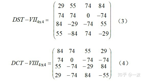 4)寻找不同变换类型的共性。我们发现DST-VII和DCT-VIII之间有着非常奇妙的关系,与DST-VII变换矩阵(3)相比,DCT-VIII(4)的每一行都和它有着相同的系数,只是顺序相反,并且在第偶数行符号相反。这样的话,我们仅需反转输入顺序并分配合适的输出符号,便可以在不增加计算复杂度的基础上轻松在DST-VII架构中实现DCT-VIII变换。