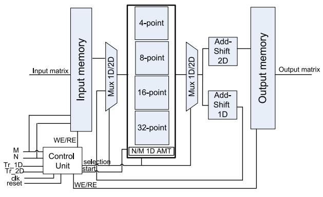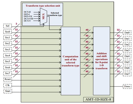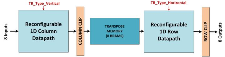 A. C. Mert等人【5】首次实现了5种变换核的2D变换,并且可以根据输入信号(TR_Type_Vertical、TR_Type_Horizontal)选择变换类型进而对相应数据通路进行重构。这种可重构的架构大大减少了area,是一种高性能架构,美中不足的是变换尺寸仅支持4×4和8×8。