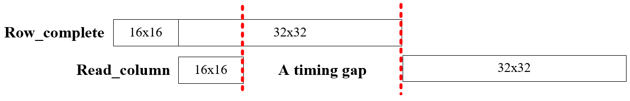 3)支持混合块尺寸的流水线设计。我们知道变换块尺寸有大有小,形状各异,那么在混合的块尺寸输入下,如何使整个设计流水线化?我们通过下面这张图来说明。以(a)为例,当我们完成16×16块的行变换,并将数据存至转置存储器(Transpose Memory, TM)后,我们开始从TM中读数据并同时进行下一个块(32×32)的行变换,当我们完成了前一个块的列读取后,当前的32×32块并没有完成行变换,因此还不能读取列数据,需要等待(A timing gap)。而我们的设计以经过高频系数舍弃所支持的最大变换尺寸32×32为范围,进行流水化,当完成32×32块范围(可以由很多不同的子块组成)内的所有行变换再开启列变换,如(c)所示。